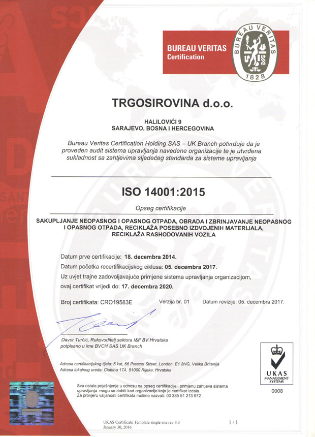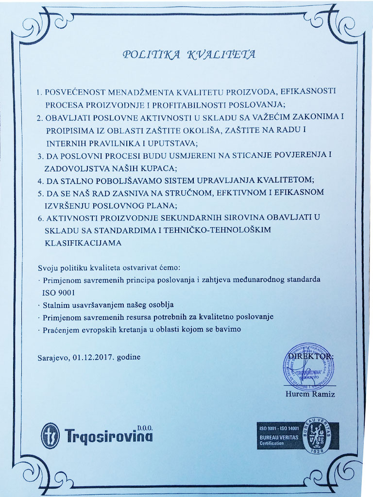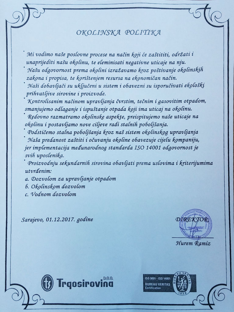 Naziv: "TRGOSIROVINA" DRUŠTVO ZA SAKUPLJANJE, PRIMARNU PRERADU INDUSTRIJSKUH ITPADAKA I PROMET SEUNDARNIH SIROVINA d.o.o. SARAJEVO